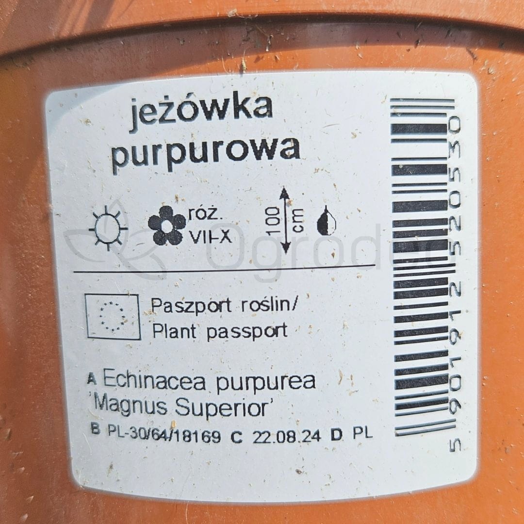 Jeżówka purpurowa 'Magnus Superior' (Echinacea purpurea) to okazała, wieloletnia bylina wyróżniająca się wyjątkowo dużymi, intensywnie różowymi lub magenta kwiatami z charakterystycznym, wypukłym, miedziano-brązowym środkiem. Kwiaty pojawiają się obficie od lipca do października, utrzymując się na sztywnych, wzniesionych łodygach o wysokości 80–100 cm, co sprawia, że roślina doskonale prezentuje się zarówno na rabatach, jak i w kompozycjach naturalistycznych czy jako kwiat cięty. Jeżówka ta jest ceniona za długie i niezawodne kwitnienie oraz odporność na suszę, mróz i choroby. Przyciąga do ogrodu motyle, pszczoły i inne pożyteczne owady, a jej nasiona stanowią pokarm dla ptaków jesienią i zimą.