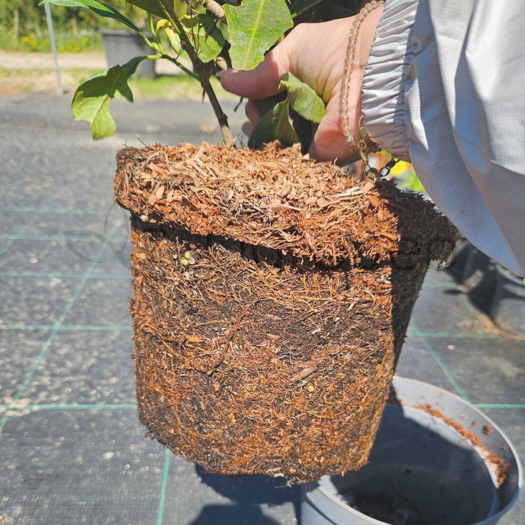 Laurowiśnia wschodnia 'Etna' (Prunus laurocerasus 'Etna') to kompaktowy, zimozielony krzew o wyprostowanym, gęstym pokroju i wyjątkowo dekoracyjnych liściach. Młode liście mają brązowo-czerwone lub pomarańczowe zabarwienie, które z czasem przechodzi w soczystą zieleń, a następnie w głęboki, ciemnozielony kolor z delikatnym połyskiem. Liście są szeroko jajowate, skórzaste, od góry błyszczące, od spodu matowe, co nadaje roślinie elegancji przez cały rok.